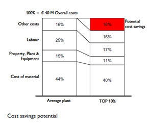 Analizzando la composizione dei costi sia a livello di company sia di plant, e comparando il 10% dei migliori con il livello medio, i ricercatori identificano un potenziale di riduzione dei costi intorno al 16%; come dire che considerando un costo medio di 40ml€ per un tipico plant, si può stimare in circa 6,5ml € il risparmio annuale.