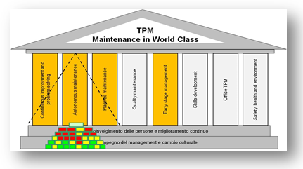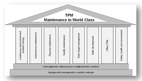 Il Total Productive Maintenance attraverso il coinvolgimento delle risorse operative nella gestione e nel corretto utilizzo degli impianti e dell’area di lavoro, punta ad ottenere la massima efficienza ed affidabilità degli impianti, la crescita delle competenze tecniche degli operatori relative al funzionamento ed alla manutenzione di base degli impianti, un utilizzo più efficace ed efficiente delle attività di manutenzione specialistica, la massima sicurezza nei reparti. Coinvolgendo tutta l’azienda ed unendo persone di differenti settori aziendali, la prestazione dell’impianto è vista in termini globali (Qualità, Costo, Servizio). Inoltre, perseguendo l’obiettivo “zero perdite” attraverso le attività basate su piccoli gruppi autonomi, anche i livelli più bassi della struttura imparano a lavorare per obiettivi, in base ai target dello stabilimento utilizzando strumenti di analisi semplici e concreti che facilitano il raggiungimento degli obiettivi.