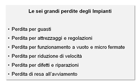 Come già accennato, uno degli scopi del TPM è quello di rendere più efficienti gli impianti. Rendere più efficienti gli impianti vuol dire fare in modo che le funzioni e le prestazioni siano espresse al massimo delle possibilità; in altre parole, questo significa eliminare le perdite che riducono l’efficienza. Con buona approssimazione, sono principalmente sei le cause che riducono in maniera rilevante l’efficienza produttiva delle macchine.