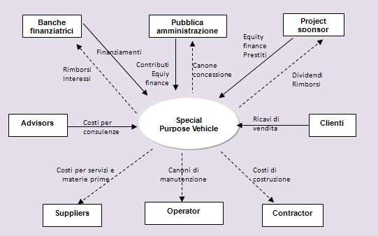 La schematizzazione della struttura di un project financing operata nella tavola 1, permette di cogliere gli aspetti economico-finanziari dell’operazione, che si caratterizza come un'organizzazione sistemica tra una pluralità di soggetti finalizzata a soddisfare le aspettative economiche di ciascuno di essi.