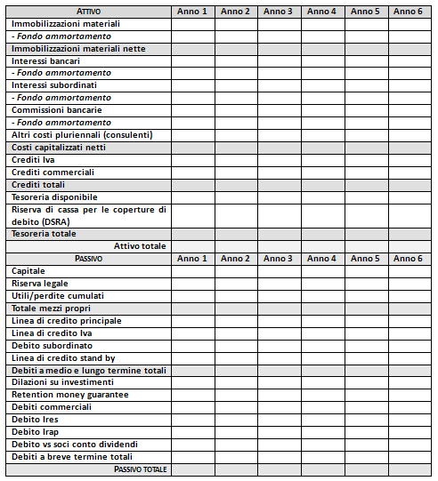 Tipicamente un piano economico finanziario è costituito dai seguenti prospetti: