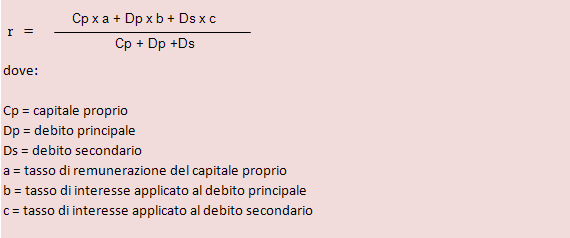 A tal proposito, viene utilizzato il cd WACC (Weigthed Average Cost of Capital), un tasso che rappresenta la remunerazione media del capitale, sia di rischio sia di debito (suddiviso in debito principale e debito secondario).