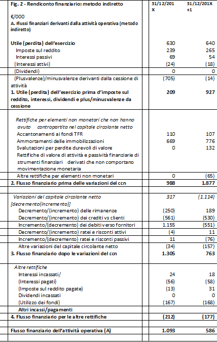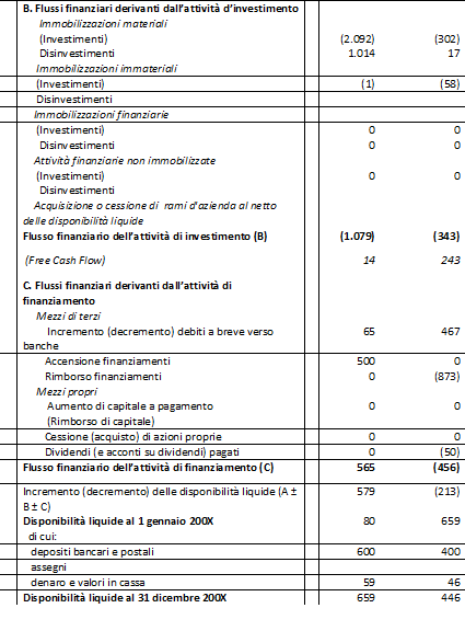 Il documento prosegue esplicitando i criteri di redazione. In particolare si sottolinea che il documento, in forma scalare, può essere redatto in via indiretta o diretta: la via indiretta riconcilia il risultato economico, ottenuto applicando il criterio di competenza economica, con il flusso di cassa, sottolineando che il reddito del periodo non equivale a una variazione dello stesso segno delle disponibilità liquide, in quanto molti costi non si accompagnano a uscite monetarie né tutti i ricavi sono correlati a entrate monetarie. Così il risultato economico di competenza del periodo, derivato dalla differenza fra costi e ricavi iscritti nel conto economico, viene rettificando considerando i costi non uscita e i ricavi non entrata, in genere rispettivamente riconducibili ad ammortamenti, plusvalori iscritti, etc. Inoltre per il principio di realizzazione dei ricavi e di maturazione dei costi, i ricavi sono contabilizzati nel periodo in cui avviene la consegna dei prodotti, anche se non è stato ottenuto l’incasso del controvalore; nello stesso modo si rilevano i costi dei fattori produttivi consumati per l’ottenimento dei prodotti, anche se non è stato ancora pagato il relativo controvalore. Il rendiconto redatto in via indiretta quantifica quindi quanta parte dell’utile del risultato del periodo è ancora investito nel capitale circolante operativo, come in precedenza definito: vendere a credito incrementa gli utili di conto economico ma non consente di monetizzare il risultato. Naturalmente se i clienti sono affidabili e pagheranno alla scadenza, la società potrà richiedere un finanziamento alla banca per disporre immediatamente del controvalore dei crediti. Tuttavia l’operazione ha un costo e un rischio, legato alla mancato incasso del credito alla scadenza.
