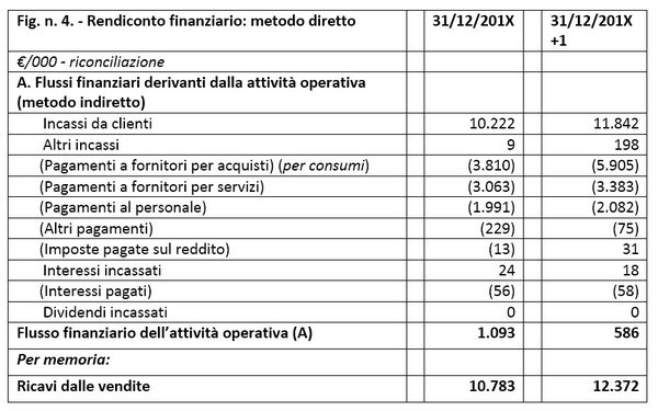 Il contenuto del budget di cassa (fig. n. 3) può essere infatti correlato alle informazioni necessarie per la redazione del rendiconto finanziario in via diretta che illustra invece la dinamica degli incassi e di pagamenti del periodo, evidenziando il flusso di cassa derivante dalla gestione operativa, informazione essenziale per la stessa sostenibilità del business aziendale (fig. 4).