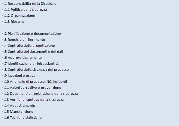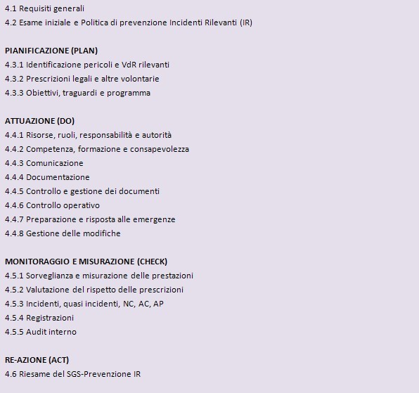 Leggendo i requisiti nell’ordine, l’allegato sembra infatti ricalcare la logica per procedure piuttosto che l’approccio per processi sopra descritto e ormai consolidato a livello internazionale. Inoltre sono dati per scontati alcuni dei requisiti su cui si fondano i moderni sistemi di gestione della sicurezza, quali l’identificazione delle norme applicabili, la verifica di conformità legislativa, la formazione, la gestione della documentazione, l’analisi degli incidenti.