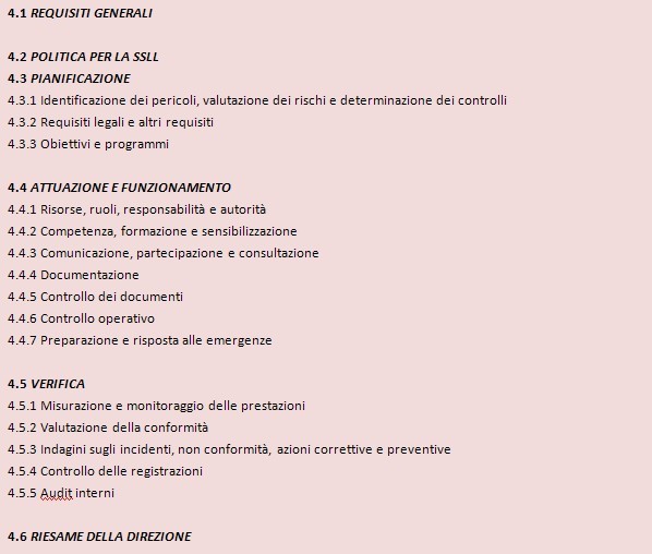 Pertanto in Italia, seppur l’approccio sistemico del decreto 626/94 e del successivo 494/96 possa far sembrare superflua l’implementazione del sistema di gestione della sicurezza, la strada indicata dal legislatore con l’art. 30 del D.Lgs. 81/08 è proprio quella di strutturare la sicurezza in azienda e negli Enti secondo i requisiti (così sono definiti i punti della norma) internazionali contenuti nella norma BS OHSAS 18001:2007.
