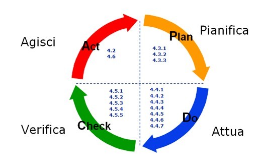 Nella nuova norma (Tavola 4) ora è possibile riconoscere la logica della Pianificazione il cui output è l’input per la successiva fase di Attuazione, il cui output è a sua volta input per la successiva fase di Monitoraggio e Misurazione (Check), i cui dati in uscita costituiscono i dati in ingresso del Riesame, che ridefinisce la Politica di sicurezza con i relativi obiettivi generali da perseguire tramite la nuova fase di Pianificazione, e così via in un continuo rimando di consolidamento dei livelli di sicurezza raggiunti e di nuovi obiettivi di sicurezza da perseguire, cosa che costituisce l’essenza del miglioramento continuo.