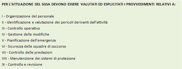 Come già accennato, a fronte dell’obbligo di attuazione di un SGSA, non sono definite linee guida specifiche; l’Allegato al decreto (Tavola 5) richiede solamente la “valutazione” e “l’esplicitazione” di alcuni requisiti, che sembrano estrapolati dalla vecchia norma 10617:1997 ormai superata.