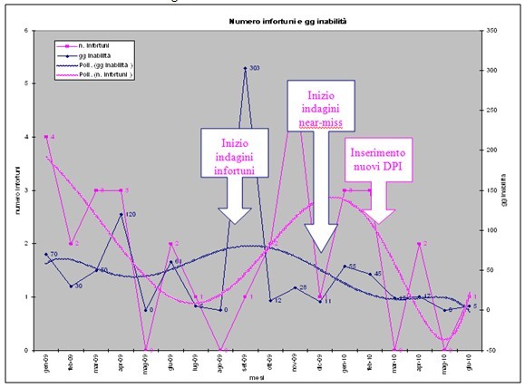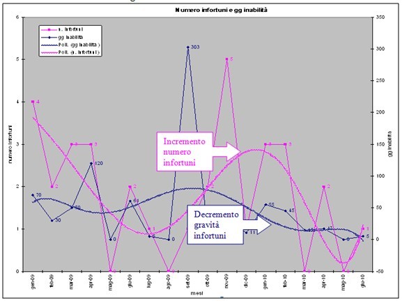 In questo grafico abbiamo messo a raffronto i giorni di assenza per infortunio e il numero degli infortuni; i dati sono stati poi rappresentati graficamente da due curve polinomiali a 5 livelli. Con questa curva possiamo notare il decremento della gravità e il dettaglio dell’incremento della frequenza.