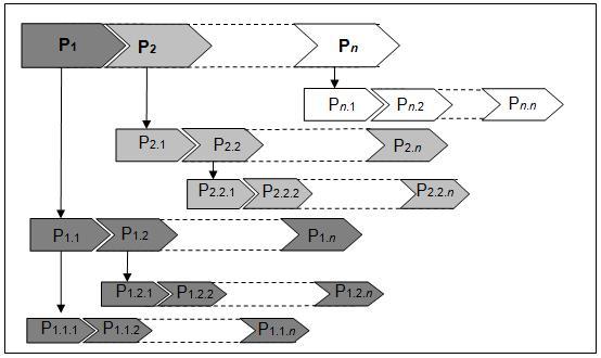 La figura che segue rappresenta schematicamente quanto qui sopra descritto; i processi primari P1, P2,…, Pn, rappresentano la filiera di partenza dalla quale, attraverso una attività di scomposizione, si sviluppa la mappa dell’azienda. Nella figura si può notare che non tutti i processi e/o i sottoprocessi sono stati oggetto di scomposizione, ciò risponde sia ad evidenti costrizioni grafiche sia a titolo esemplificativo di quanto sopra.