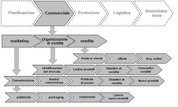 A titolo di ulteriore esempio nella figura che segue è riportata la scomposizione di un processo commerciale di una generica azienda di produzione. Si può notare che il sottoprocesso “marketing” di questa azienda, per gli obiettivi di revisione assunti, per essere rappresentato a fondo, necessita di due livelli di rappresentazione.