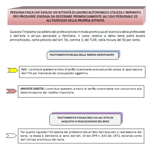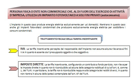 Considerata la molteplicità di situazioni che possono in concreto verificarsi, in relazione alle diverse tipologie di soggetti che assumono la qualifica di responsabile dell’impianto e alle diverse modalità di utilizzo dello stesso, si illustra di seguito il trattamento fiscale della tariffa incentivante e dell’eventuale premio aggiuntivo, nonché dell’attività di vendita dell’energia prodotta.