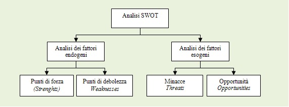 I punti di forza e di debolezza sono considerati fattori endogeni in quanto costituiti da tutti quegli elementi sui quali, essendo parti integranti del sistema impresa, è possibile intervenire. Le minacce e opportunità sono invece considerate fattori esogeni in quanto costituiti da tutte quelle variabili esterne all’organizzazione che possono condizionarla, sulle quali però l’impresa non può intervenire direttamente, ma dovrebbe comunque tenere sotto controllo in modo da sfruttare gli eventi positivi e prevenire quelli negativi.