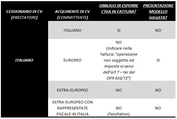 Mentre, ove il committente risieda fuori dall’ambito nazionale, senza che vi abbia, sul territorio dello Stato, un rappresentante fiscale, non vi è l’obbligo di esporre l’Iva in fattura. Da quanto finora esposto è possibile e, soprattutto utile, operare una schematizzazione, (vedi Tavola 1), per proporre un quadro pratico completo.
