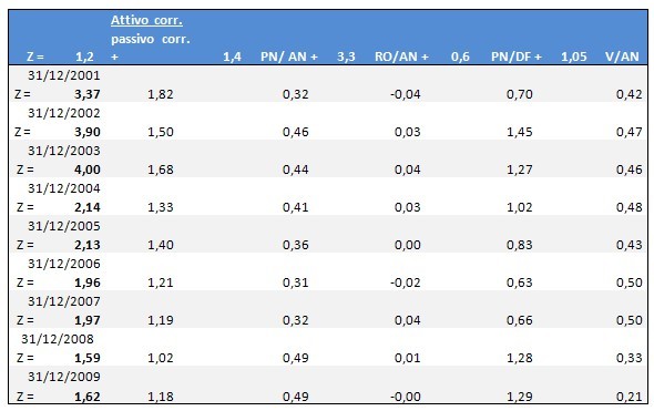 Come emerge dalle elaborazioni svolte sui bilanci della società a partire dal 2001 fino al 2009, il valore dello Z score ha il seguente andamento: