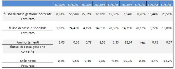 Il cash flow aziendale, pur positivo, è costituito principalmente dalla componente ammortamenti, come evidenzia il rapporto fra ammortamenti e flusso di cassa della gestione corrente, mentre la politica del circolante, connessa al supporto delle vendite, assorbe risorse per tutti gli anni. Risorse crescenti sono inoltre assorbite dagli oneri finanziari e dalle imposte, con la conseguenza di generare risorse nette insufficienti a sostenere il volume degli investimenti di rinnovo necessari per proseguire l’attività. Dal 2003 il flusso di cassa disponibile diventa negativo: il fabbisogno finanziario viene coperto con ricorso all’indebitamento, con la conseguenza che il rapporto debiti finanziari /fatturato si avvicina all’unità, per superarlo a partire dal 2008, segnalando una situazione di non ritorno.