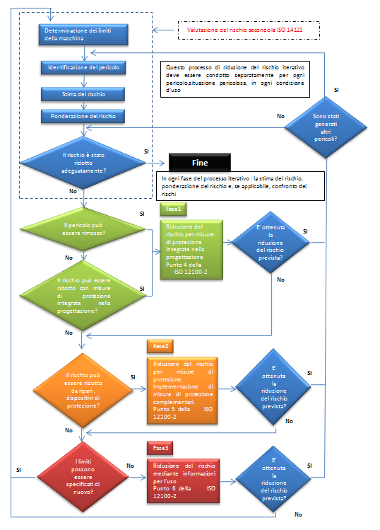 Lo schema riportato nella Tavola 1 riassume in forma grafica il processo iterativo di valutazione del rischio. Da questo schema si può anche dedurre un’informazione importante sulle priorità da adottare per conseguire lo scopo finale: la fase 1 indica la prima modalità attraverso la quale si deve ricercare la misura per la riduzione del rischio, cioè con misure integrate nella progettazione. Se questo non consente di raggiungere l’obiettivo, si possono adottare le misure indicate nella fase 2, cioè implementare protezioni complementari, fisiche o immateriali, fisse o mobili, che proteggano la persona esposta dai rischi individuati. Se anche questa misura non consente di ridurre sufficientemente il rischio, è opportuno ricorrere alla fase 3 inserendo adeguate informazioni comportamentali nel manuale d’uso e manutenzione e/o prescrivendo l’uso di adeguati Dispositivi di Protezione Individuale (D.P.I.). Ne deriva che, anche per redigere correttamente il manuale d’uso e manutenzione, deve essere stata fatta una corretta analisi del rischio. Le tre modalità possono anche essere utilizzate congiuntamente per l’eliminazione o riduzione del rischio.