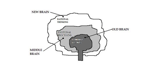 Le scoperte delle neuroscienze mostrano che, in aggiunta a questi due emisferi, esiste una parte più profonda, “il cervello rettile” o Old Brain che “decide”, ossia il cervello primitivo prende in considerazione l’apporto degli altri due cervelli, ma controlla il processo decisionale.